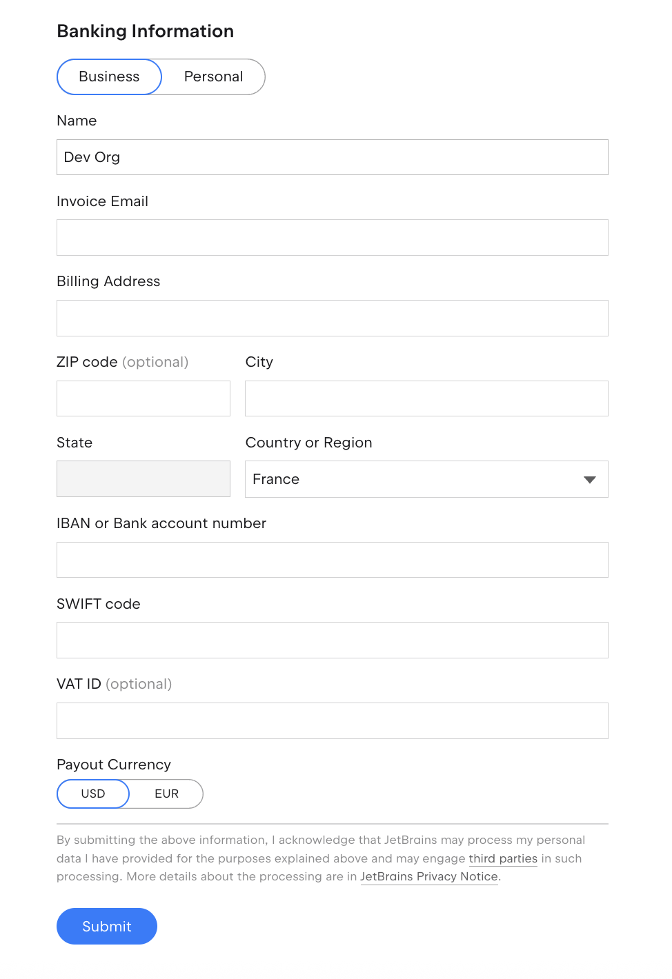In addition to the above, all traders will be required to provide to JetBrains their banking details.