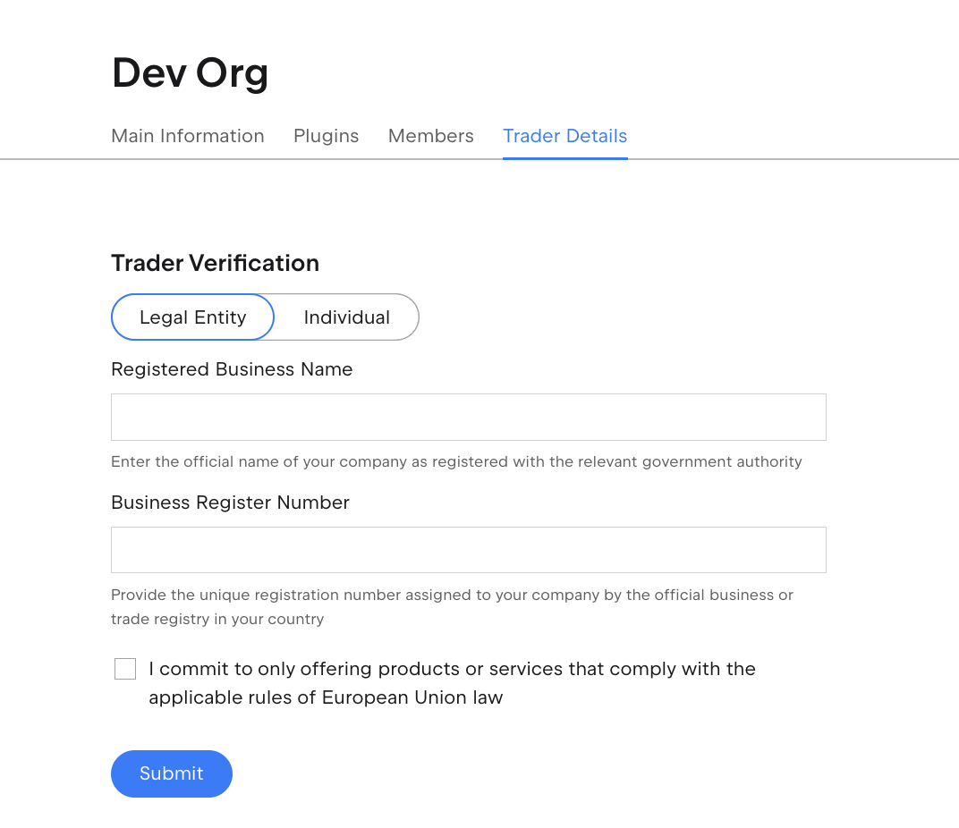 Depending on your status, end-users of the plugins will be informed that consumer protection laws will (if you are a trader) or will not (if you are not a trader) apply to any contracts concluded between you and them. Additionally, some of the information provided, such as your name, email, address, and phone number, will be displayed to end-users.